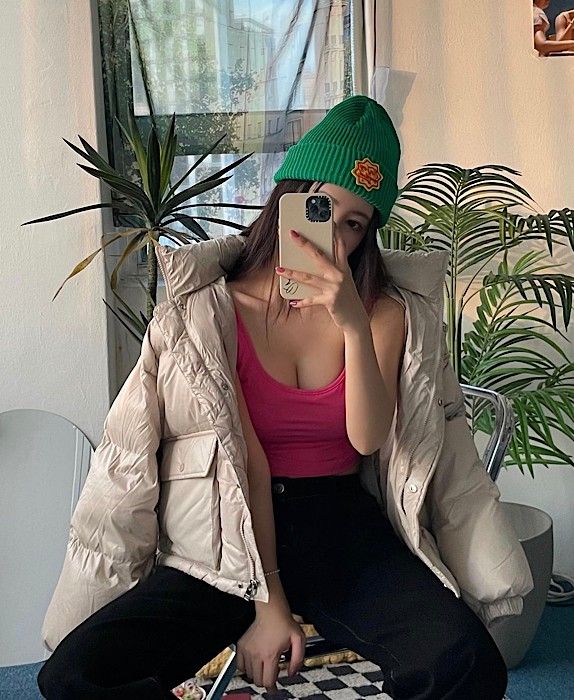 쇼트 패딩에 초록색 비니를 매치해 패셔니스타 면모도 선보였다. 선명한 색채의 옷을 입어 상큼미를 극대화했다.